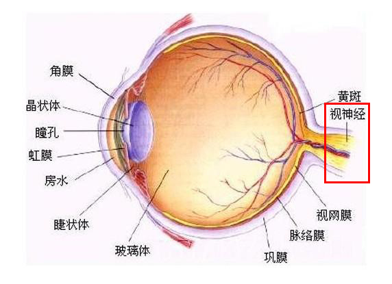 青光眼患者的眼睛同時存在這兩個特征:視神經(jīng)萎縮,和視野損害。如圖所示,視神經(jīng)是中樞神經(jīng)系統(tǒng)的一部分,也是把視覺信息傳送到大腦視中樞的傳導(dǎo)路徑的起點。