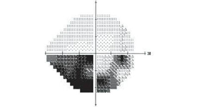 視野指的則是眼睛看向正前方時所能看到的空間范圍。在檢查中,視野常被劃分為四個象限,下圖就是一位青光眼患者的視野檢查結(jié)果,圖中黑色部分為視野缺損的部分。