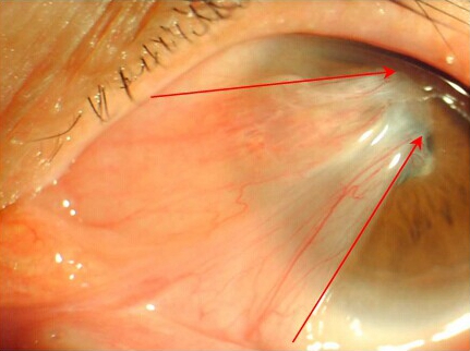 翼狀胬肉是受外界刺激而引起的局部球結(jié)膜纖維血管組織增生的一種慢性炎癥病變,可伴有新生血管、色素沉著等改變,呈三角形,可侵犯角膜,單眼或雙眼患病。因其形狀酷似昆蟲(chóng)的翅膀故名為翼狀胬肉,它是臨床上最為常見(jiàn)的眼科疾病之一。