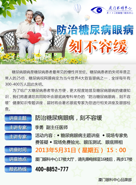 【文章導(dǎo)讀】【名醫(yī)講堂糖尿病眼病防治】5月31日,本周五,糖尿病眼病防治講堂將在廈門眼科中心17樓開講,所有受糖尿病眼病疾病困擾的患者,均可來參與聽講,期間也會(huì)免費(fèi)為所有人免費(fèi)驗(yàn)光、