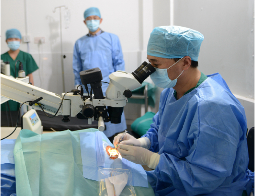 姚曉明博士在簡陋的手術(shù)室里為尼泊爾患者實施復(fù)明手術(shù)。