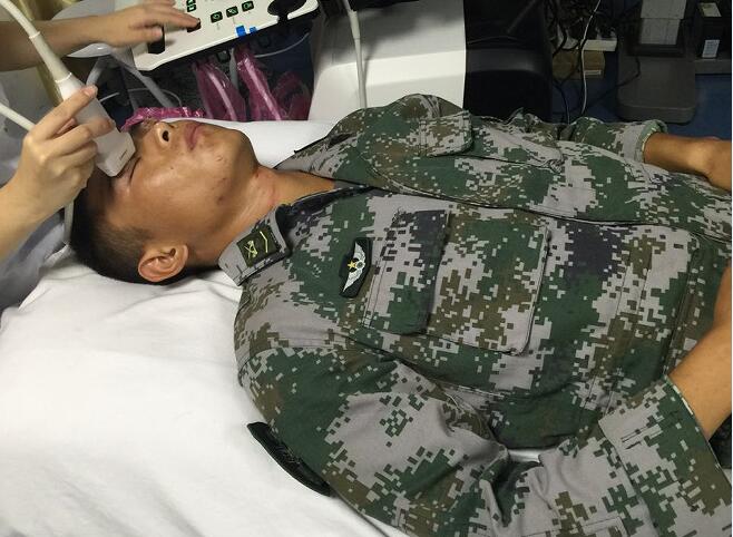 向領(lǐng)導匯報完情況后,在戰(zhàn)友的陪同下,小王趕到廈門眼科中心。得知小王是抗臺搶險受傷后,廈門眼科中心第一時間為小王開辟綠色通道--“優(yōu)先就診、優(yōu)先檢查”。經(jīng)過詳細的眼部B 超和視力檢查后,醫(yī)生診斷為“左眼視力只剩光感、左眼鈍挫傷,前房出血,眼內(nèi)病況待查”,當即建議小王暫時放下救援任務,及時到院接受治療,否則可能會引發(fā)繼發(fā)性青光眼,甚至造成視神經(jīng)損傷導致永久失明。