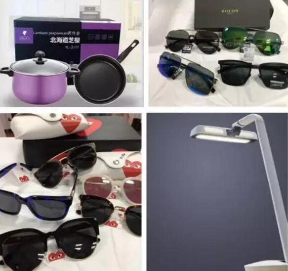 價值1980元的警察太陽鏡、價值598元的豪華鍋具、價值798元的暴龍?zhí)栫R、價值680元的李維斯手表、價值398元的艾尼雅太陽鏡和川久保玲太陽鏡、價值188元的魔法化妝鏡、價值168元護(hù)眼臺燈、價值150元U盤、價值108元進(jìn)口高檔毛巾……