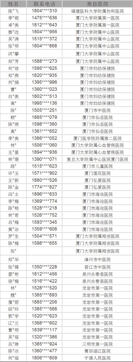 經(jīng)過(guò)審核完成后,廈門13家醫(yī)院34名醫(yī)護(hù)人員、福州1家醫(yī)院1名醫(yī)護(hù)人員、漳州1家醫(yī)院1名醫(yī)護(hù)人員、泉州2家醫(yī)院3名醫(yī)護(hù)人員、龍巖1家醫(yī)院8名醫(yī)護(hù)人員、三明1家醫(yī)院1名醫(yī)護(hù)人員、莆田1家醫(yī)院1名醫(yī)護(hù)人員、寧德1家醫(yī)院1名醫(yī)護(hù)人員獲得了免費(fèi)手術(shù)資格。名單公示如下: