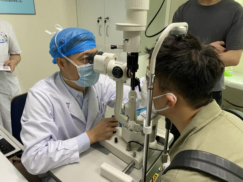 ▲廈門眼科中心屈光科執(zhí)行主任揭黎明為龍峰做術前檢查