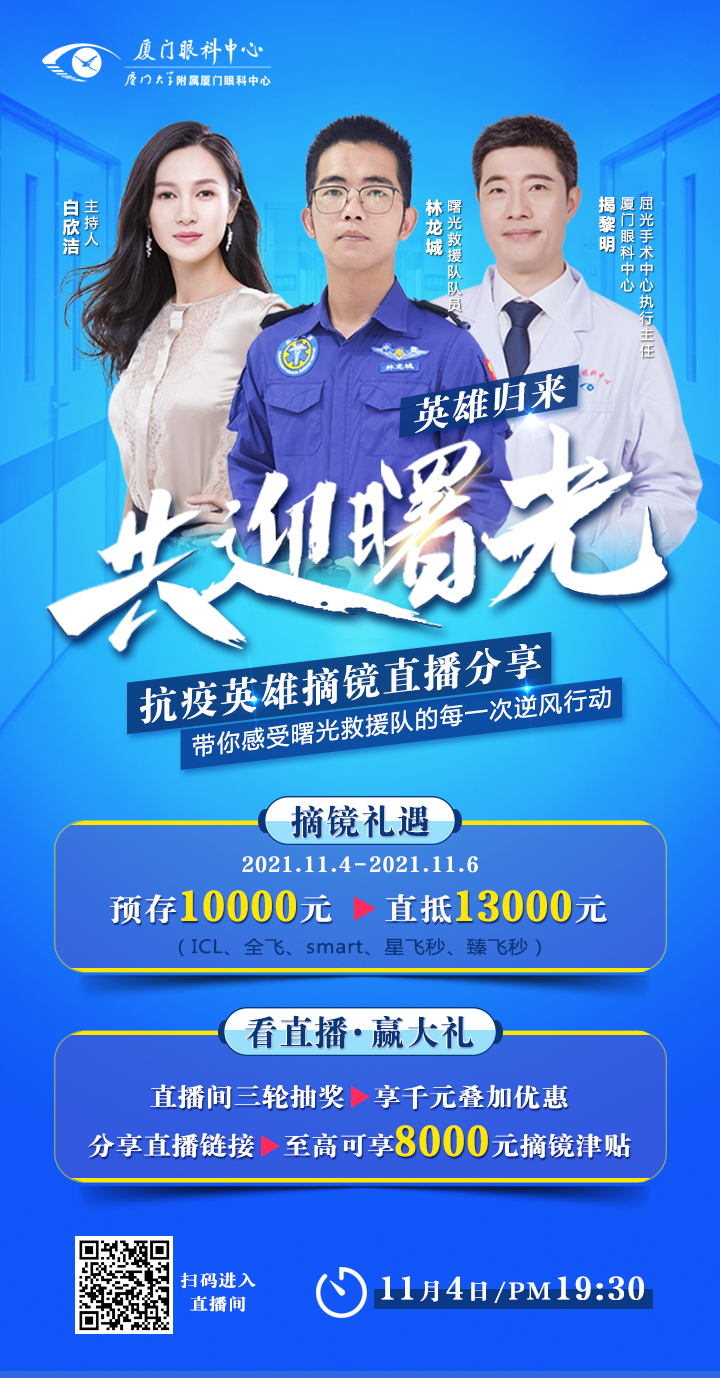 11月4日19:30,抗疫英雄、廈門眼科中心公益摘鏡體驗官——林龍城將通過直播分享他的曙光故事、抗疫經(jīng)歷及摘鏡體驗,廈門眼科中心屈光手術(shù)中心執(zhí)行主任、主任醫(yī)師揭黎明將現(xiàn)場揭秘手術(shù)過程。