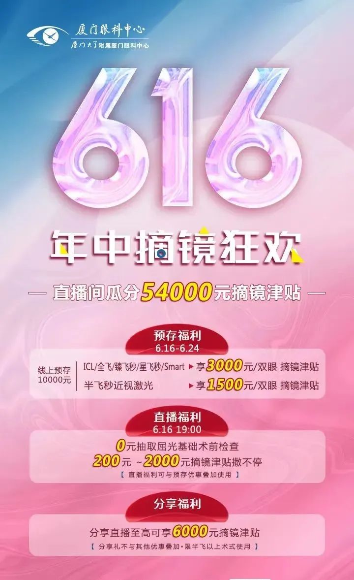 活動(dòng)期間,預(yù)存10000元,ICL/全飛秒/臻飛秒/星飛秒/smart可享3000元摘鏡優(yōu)惠;半飛秒即享1500元摘鏡優(yōu)惠。