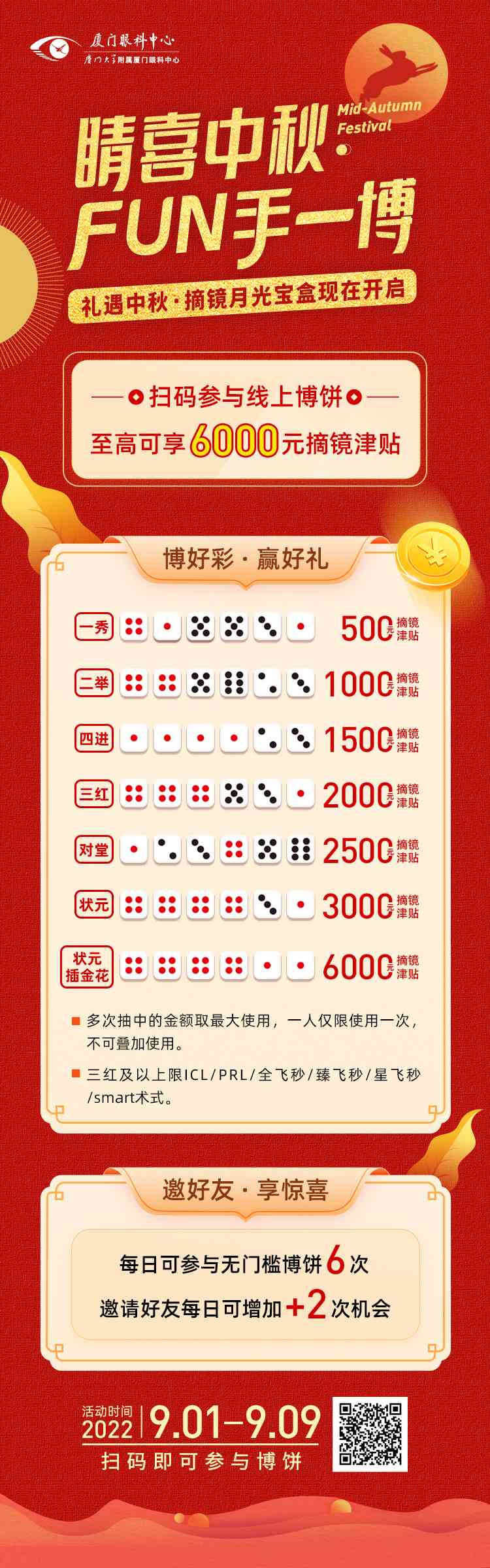 1、活動(dòng)期間,每人每天有6次博餅機(jī)會(huì),成功邀請(qǐng)一位好友參與博餅即可增加2次博餅機(jī)會(huì)。