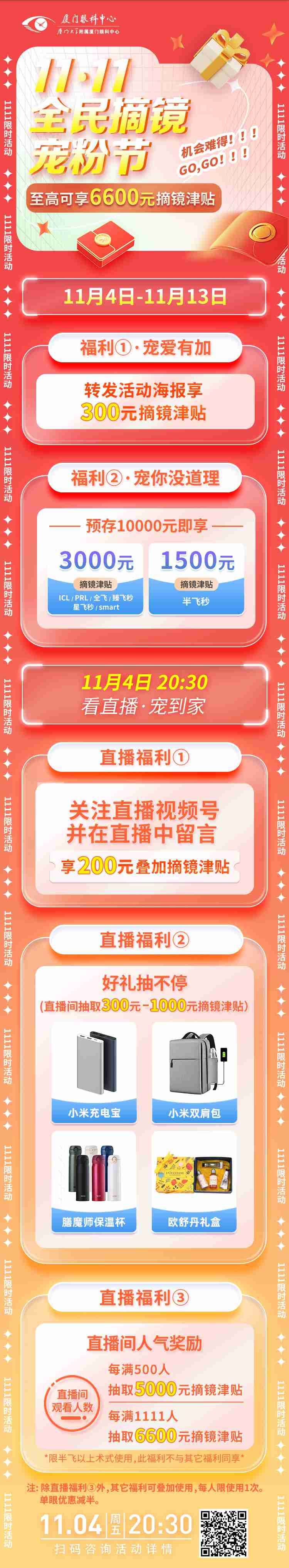 ③(錦鯉獎(jiǎng))直播間觀看人數(shù)每滿 500 人 ,抽取 5000 元摘鏡優(yōu)惠 1 人; 直播間觀看人數(shù)每滿1111 人 ,抽取 6600 元摘鏡優(yōu)惠 1 人 。