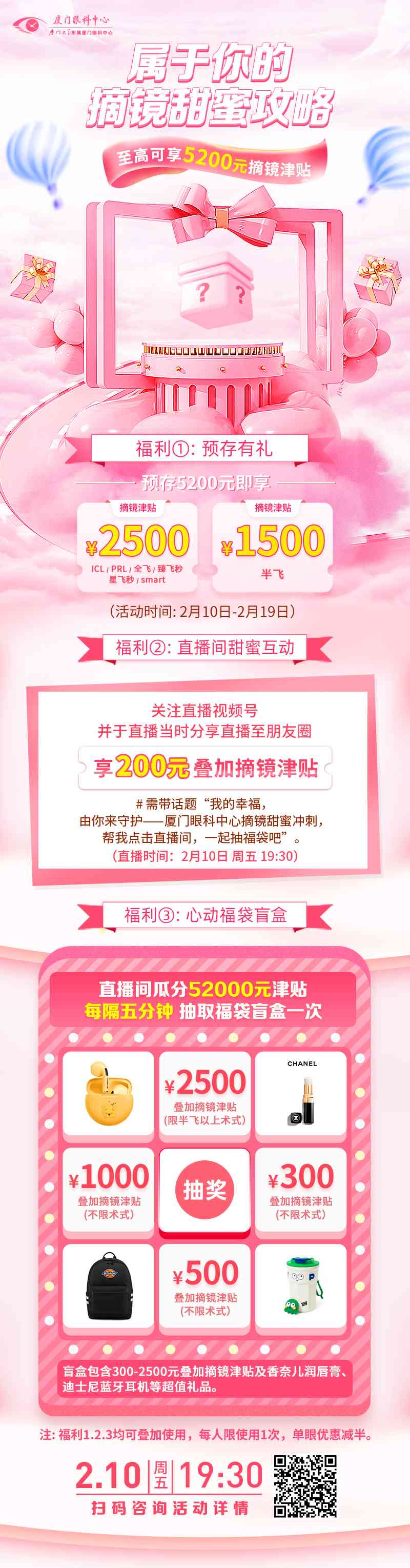 觀看直播,并分享直播至朋友圈,帶話題「我的幸福,由你來守護——廈門眼科中心摘鏡甜蜜沖刺,幫我點擊直播間,一起抽福袋吧」,即享200元疊加摘鏡津貼。