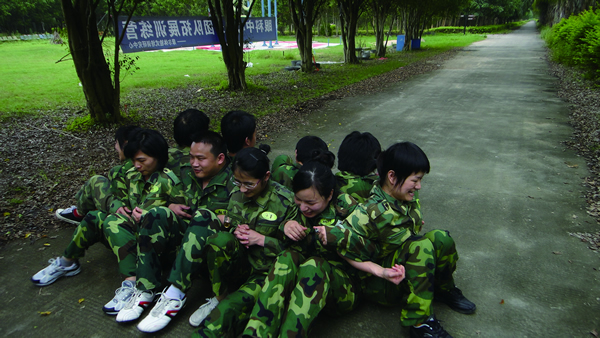 一開始大家沒有掌握到這項訓(xùn)練實質(zhì)上的意義,只是一味想著自己要站起來,結(jié)果無論是我們的“勇者無敵隊”還是“必勝莊園隊”都以失敗告終。要么剛站起來一半,就被旁邊的伙伴拉下去了;要么根本就找不到支點,沒辦法起來;要么已經(jīng)站起來了,還有伙伴沒有同時起來,仍然視為失敗。