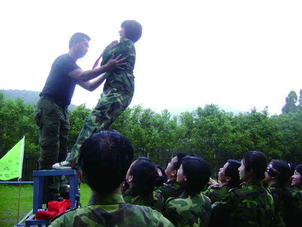 “相信大家,放心把你自己交給大家,你什么都不要想,大家會安全地把你接住”這是“信任背摔”項目的內(nèi)涵所在。項目形式是一個人站在4米高的位置,手被紅領(lǐng)巾綁住,然后在隊友“我們準(zhǔn)備好了,我們支持你,我們愛你”中從高空倒下,你的隊友們會用手臂把你安全接住,讓你感受團隊?wèi)?zhàn)友的臂膀與赤誠。