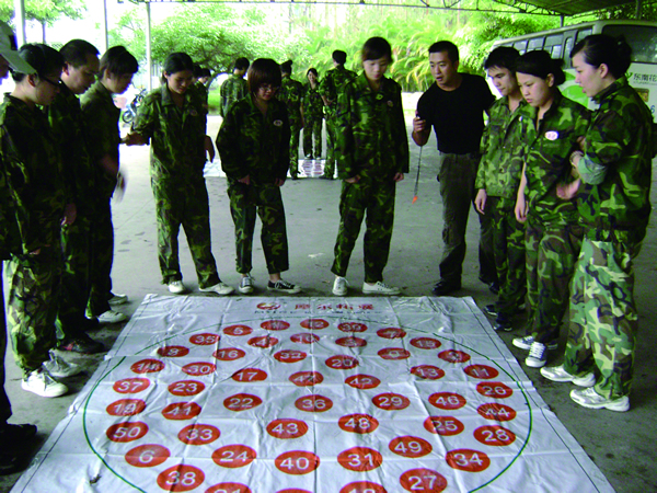 一張印有50個豪無規(guī)律數(shù)字的塑料毯,項目要求團隊在最快的時間里按1~50的順序踩數(shù)字,同時不能踩到毯子以及毯子上方不能同時出現(xiàn)兩只腳,否則要重新開始。在這項目中我們的“必勝莊園隊”認真思考,仔細研究塑料毯上看似無規(guī)律的數(shù)字其實也不是完全沒有規(guī)律的,上方的數(shù)字擺放比較稀疏,左右兩側(cè)和下方會相對密集。于是他們根據(jù)數(shù)字的規(guī)律調(diào)整人員分布,左右兩側(cè)和下方盡量多些人,大家手拉手互相扶持。果然,很有效率,輕輕松松地完成并以較短時間戰(zhàn)勝。而“勇者無敵隊”,由于沒有講究方法進行協(xié)條分工,是幾個人輪流踩數(shù)字,一直圍繞著毯子在跑與踩。幾輪下來,一個個滿頭大汗,也筋疲力盡,結(jié)果還是以戰(zhàn)敗告終。
