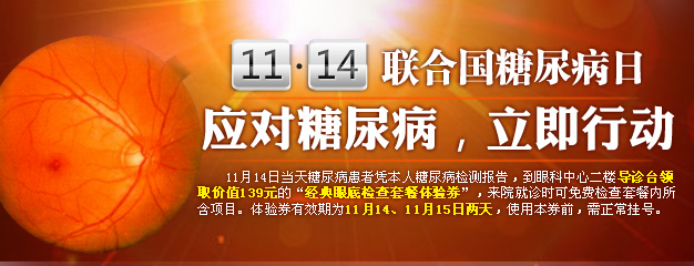 11月14日當(dāng)天糖尿病患者憑本人糖尿病檢測報告,到眼科中心二樓導(dǎo)診臺領(lǐng)取價值139元的"經(jīng)典眼底檢查套餐體驗券",來院就診時可免費(fèi)檢查套餐內(nèi)所含項目。體驗券有效期為11月14、11月15日兩天,使用本券前,需正常掛號。