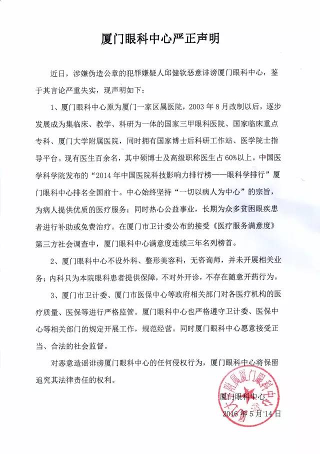 近日,涉嫌偽造公章的犯罪嫌疑人邱健欽惡意攻擊誹謗廈門(mén)眼科中心,鑒于其言論嚴(yán)重失實(shí),現(xiàn)聲明如下:
