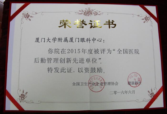 為積極配合醫(yī)藥衛(wèi)生體制改革,進一步調(diào)動醫(yī)院后勤改革與發(fā)展的積極性,推進全國醫(yī)院后勤建設(shè)的全面提升和發(fā)展,在國家衛(wèi)生計生委醫(yī)療管理服務(wù)中心、國家衛(wèi)計委醫(yī)院管理研究所的指導(dǎo)組織下,全國衛(wèi)生產(chǎn)業(yè)企業(yè)管理協(xié)會與健康報社聯(lián)合開展了“2015年度全國醫(yī)院后勤管理創(chuàng)新先進單位”評選活動。經(jīng)過嚴格的初審、評審、公示、終審,廈門大學附屬廈門眼科中心獲此殊榮。我院在醫(yī)院后勤管理創(chuàng)新方面成效顯著,得到了衛(wèi)生相關(guān)部門的肯定與表彰。