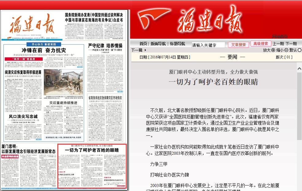 近日,福建日?qǐng)?bào)記者前往廈門眼科中心,對(duì)這家作為改制典范的醫(yī)院進(jìn)行了深入采訪。7月14日,福建日?qǐng)?bào)頭版刊登了報(bào)道,特別對(duì)廈門眼科中心改制以來(lái)的轉(zhuǎn)型升級(jí)、醫(yī)療服務(wù)和人才引進(jìn)等方面的創(chuàng)新舉措給予了高度的肯定。相關(guān)文章轉(zhuǎn)載如下: