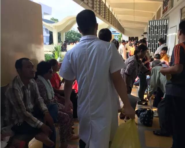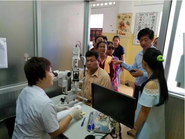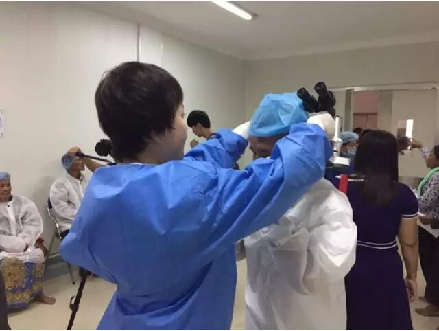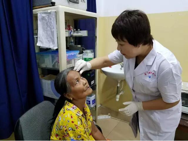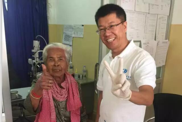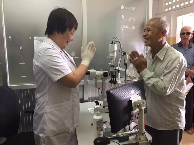 這個(gè)情況被手術(shù)結(jié)束出來取晶體的護(hù)士看到了,她報(bào)告給了醫(yī)療隊(duì)隊(duì)長李立梅博士,李博士聽到后立刻走出手術(shù)室來到老人身旁,握起老人的手親切問到:“奶奶,你怎么了?是哪里不舒服嗎?”老人用弱小地聲音結(jié)結(jié)巴巴地回答了一堆柬語,經(jīng)過翻譯翻譯后才知道,老人是因?yàn)楹ε率中g(shù)心里緊張,再加上手術(shù)室的冷氣才發(fā)抖的。