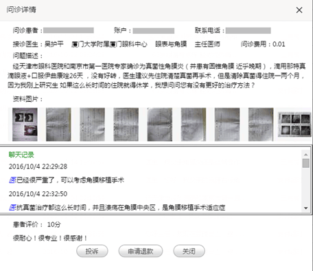 眼科醫(yī)院和南京第一醫(yī)院專家確診為真菌性角膜炎,并患有圓錐角膜近乎晚期,使用相關(guān)藥物沒有好轉(zhuǎn),江西當(dāng)?shù)氐尼t(yī)生建議其先住院清除真菌再手術(shù)。因為清除真菌得住院一兩個月,剛上研究生的他如果長時間住院就得休學(xué),實在進(jìn)退兩難的他,通過眼科通APP接通了廈門眼科中心眼表與角膜專科的學(xué)科帶頭人吳護平主任的問診服務(wù),盡管已經(jīng)22:30,吳護平主任還是耐心解答了他的疑問,并且給出了盡快做角膜移植手術(shù)的建議。因為廈門眼科中心有與華廈眼科醫(yī)院集團下各地的眼庫聯(lián)動,所以患者很快就有角膜材料。吳護平30分鐘內(nèi)的4個答復(fù)就大大緩解了小雷的焦慮,避免了休學(xué)危機,他連連道謝并打算盡快接受手術(shù)。
