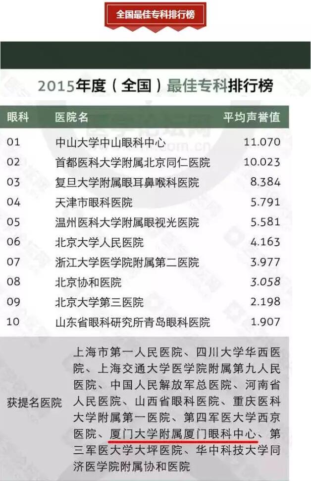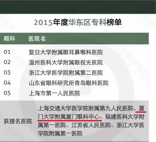 在此次榜單中的我院(廈門大學(xué)附屬?gòu)B門眼科中心)在“全國(guó)較佳專科排行榜”以及“華東區(qū)醫(yī)院較佳??婆判邪?rdquo;中榮獲雙提名。