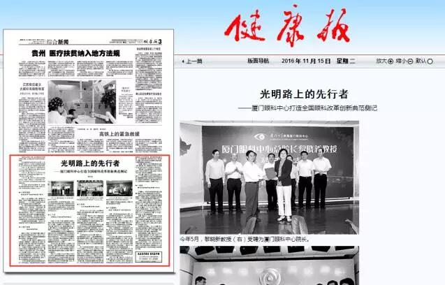 11月15日,由國家衛(wèi)生計生委醫(yī)政醫(yī)管局主辦,《健康報》社承辦的“改善醫(yī)療服務(wù) 我們在行動”欄目對廈門大學(xué)附屬廈門眼科中心的改革創(chuàng)新行為進行專題報道,高度肯定了廈門眼科中心一切以病人為中心,踐行供給側(cè)改革所取得的成績。