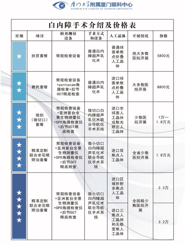 為最大程度滿足患者的個性化需求,眼科中心在原有套餐的基礎上,更加精細化,根據(jù)手術方式、人工晶體的品牌、材質(zhì)及手術耗品等不同,推出六大白內(nèi)障手術套餐價,使眼病患者享受指定服務,放心就醫(yī),明白消費。