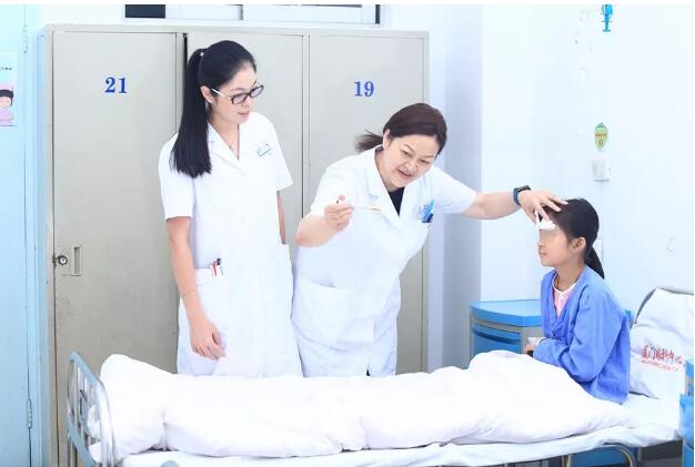資料圖:潘美華主任(中)與科室醫(yī)生術(shù)后關(guān)愛患兒
