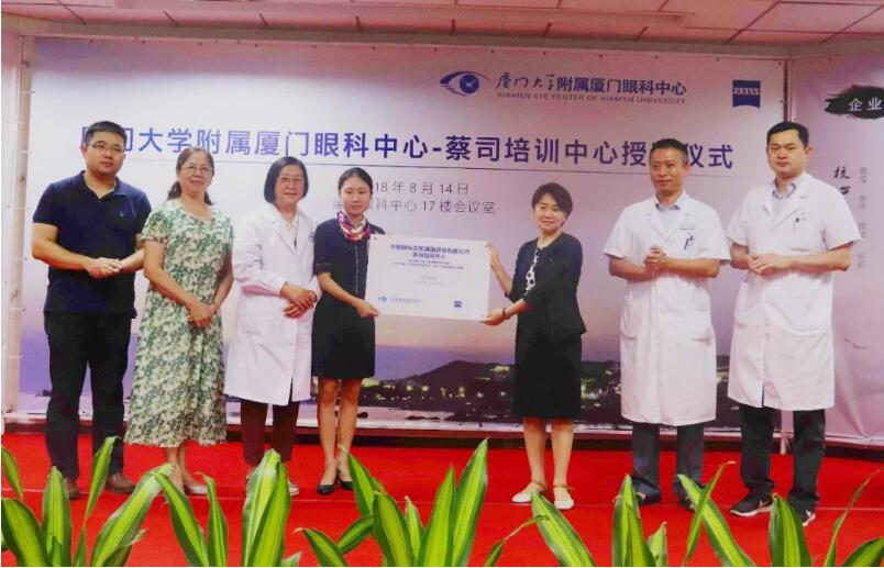儀式上,廈門眼科中心總院長黎曉新教授、德國卡爾蔡司袁博經(jīng)理、廈門眼科中心黨支部書記陳逸恬、廈門眼科中心業(yè)務(wù)副院長張淳博士、廈門眼科中心副總經(jīng)理陳昉、廈門眼科中心特檢主任李明翰博士一同為培訓(xùn)中心揭牌。
