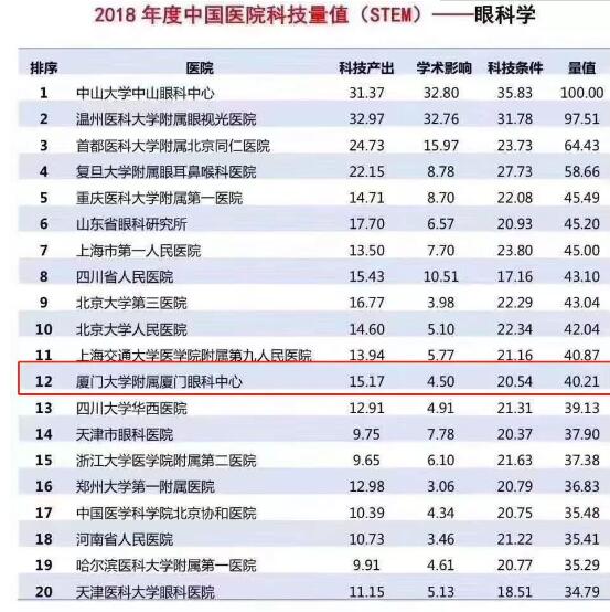 廈門大學(xué)附屬廈門眼科中心榜上有名,位列??瓢駟稳珖?2!