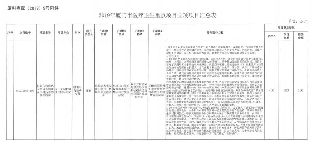 2019年廈門市醫(yī)療衛(wèi)生重點項目評選結(jié)果出爐啦!經(jīng)過層層嚴格評選、考核、調(diào)研廈門眼科中心眼表與角膜病??粕陥箜椖揩@批“市級醫(yī)療衛(wèi)生重點項目”同時獲撥資助基金150萬元項目,總投入450萬元!