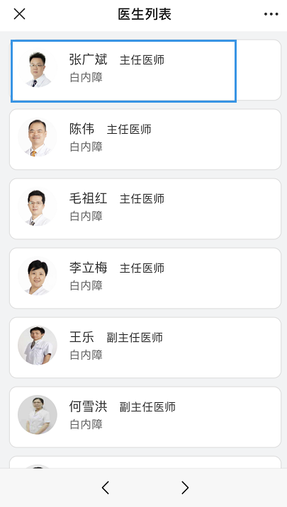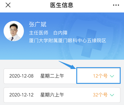 點擊“預(yù)約掛號”,選擇需要預(yù)約院區(qū)(如五緣院區(qū)),搜索或者選擇需要預(yù)約的科室(如白內(nèi)障科),選擇需要預(yù)約的醫(yī)生(如張廣斌醫(yī)生),確認預(yù)約時間