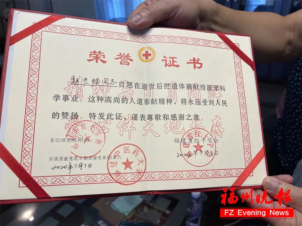 當(dāng)晚9時多,按照其遺愿,他如愿以償,捐獻有用的器官——眼角膜,并“坐”上開往福建中醫(yī)藥大學(xué)的車子,成為一名大體老師(醫(yī)學(xué)界對遺體捐贈者的尊稱)。