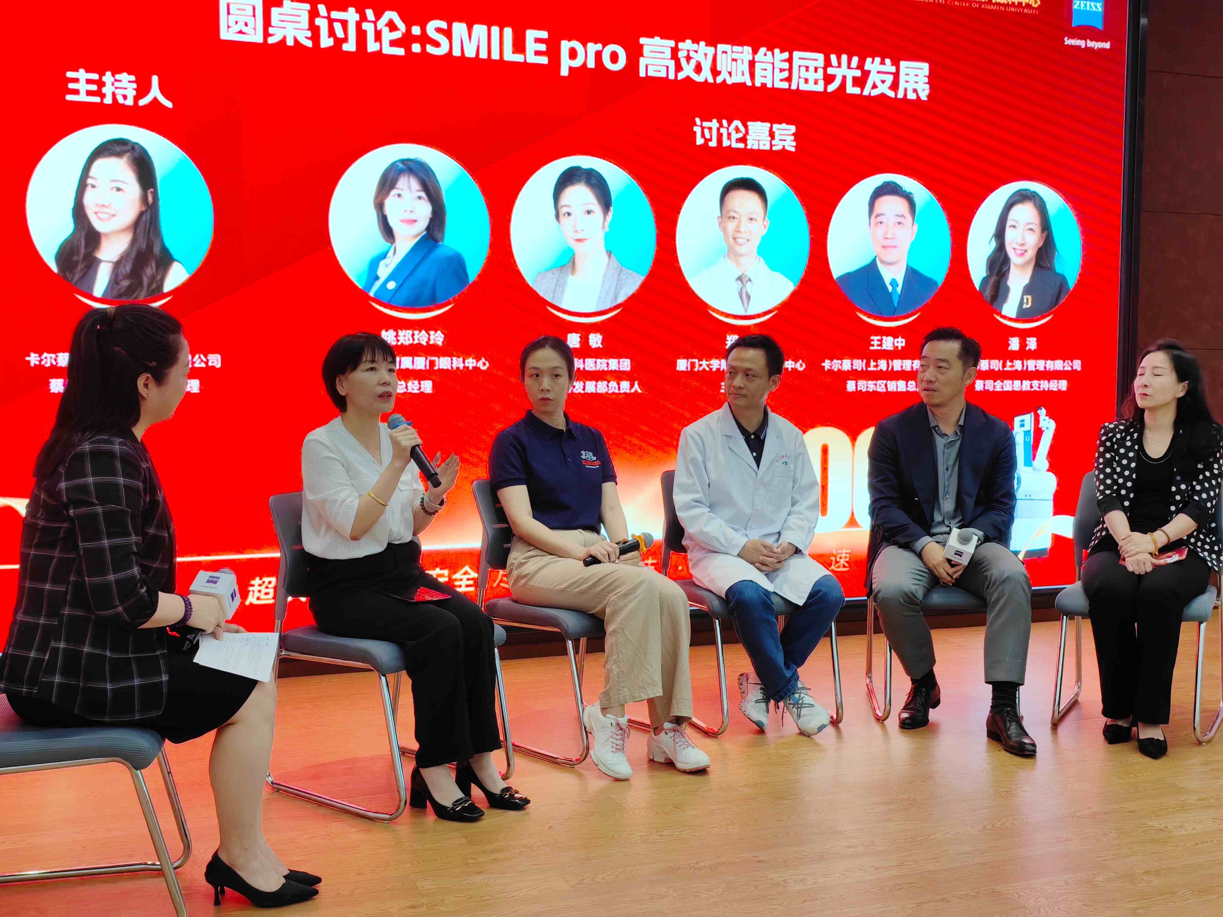 廈門眼科中心總經理姚鄭玲玲、華廈眼科醫(yī)院集團屈光學科發(fā)展部負責人唐敏、廈門眼科中心屈光科主任醫(yī)師鄭林、蔡司眼科大東區(qū)銷售總監(jiān)王建中、蔡司醫(yī)療屈光全國患教經理潘澤等嘉賓,圍繞SMILE Pro技術在屈光領域的應用現狀、未來發(fā)展、提升手術質量與患者體驗等議題展開深度探討: