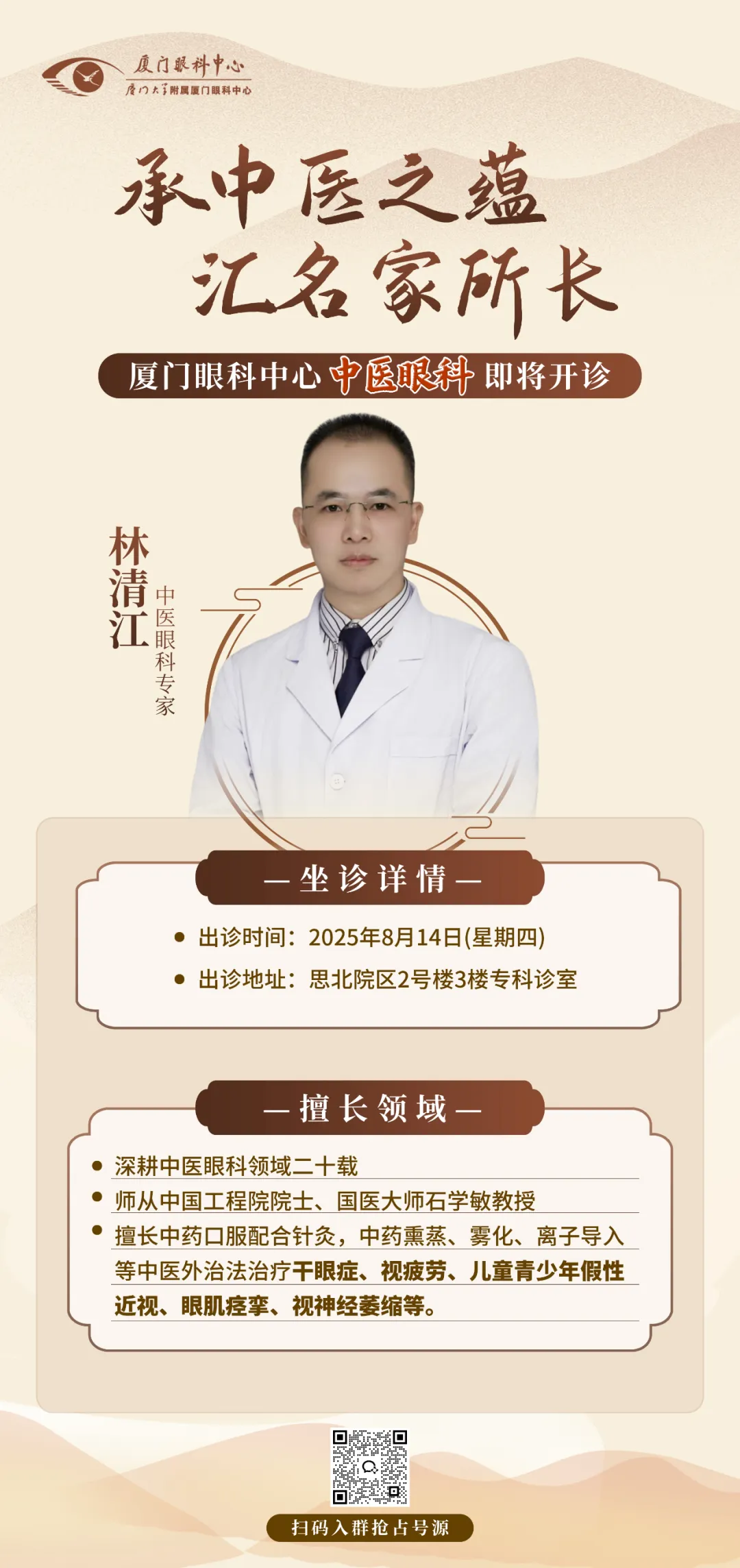 8月14日,林清江醫(yī)生將親自坐鎮(zhèn)廈門眼科中心中醫(yī)眼科門診,目前已開設專家預約通道。