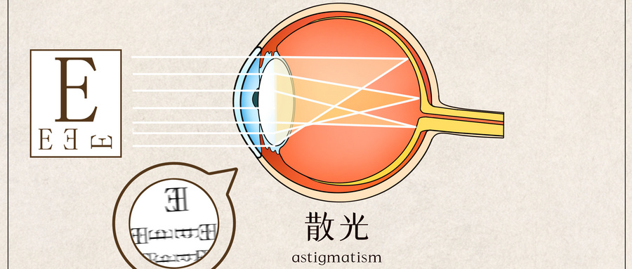 由于角膜形態(tài)或晶狀體等表面不規(guī)則,光線通過(guò)眼球折射后無(wú)法匯聚成焦點(diǎn)。嚴(yán)重散光者看近看遠(yuǎn)均不清楚。