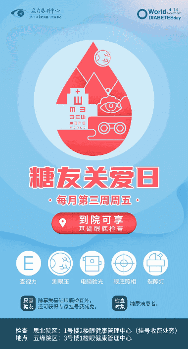 廈門(mén)眼科中心設(shè)立糖友關(guān)愛(ài)日,以倡導(dǎo)早檢查、早發(fā)現(xiàn)、早治療、長(zhǎng)期隨診為核心,為糖尿病患者及其家屬建立眼健康檔案,并提供控糖指導(dǎo)、眼健康篩查、慢病跟蹤管理等專(zhuān)業(yè)診療服務(wù),從而保障糖尿病患者的視覺(jué)質(zhì)量,從根本上降低糖尿病的致盲率。