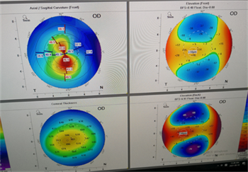上圖按順時(shí)針方向依次為角膜前表面曲率,角膜前表面高度,角膜后表面高度,角膜厚度。